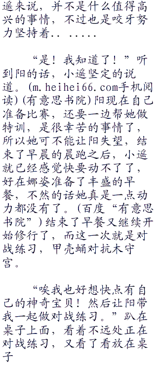 “没有,你说的对,其实我想想,像阿阳这么优秀的训练家,为了比赛都还要那么努力的练习,可是我想的只是让自己出风头,但是从今以后我不会了,我会靠我自己的努力,和我的神奇宝贝们一起努力一起成长的!”小遥闻声后摇了摇头,现在她真的觉得阳训斥的并没有错。
