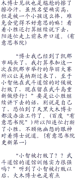 “大木博士你好,我的名字叫做小胜,是阿阳的朋友,来自芳缘地方的橙华市!我可是你的粉丝哦,你发布的作品我每一部都有看!”只见阳刚刚开口叫了一声的时候,小胜就挤了上来一连串的开口道。弄的对面的大木博士愣在了原地,而旁边的阳也是一阵无语,这个小胜还真是崇拜大木博士呢!硬是把自己给挤开了。