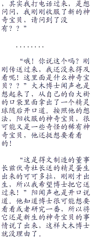 很快的阳来到了神奇宝贝中心,打开了电话拨通了大木研究所的号码,嘟嘟的几声之后,电话的屏幕闪现出来了,眼前以为头发花白的老者出现在眼前了,不是别人正是大木博士,前段时间打回去他没有再研究所,不过这一次刚好,卡到了屏幕上的人后,小胜顿时一阵兴奋。而对面的大木博士见到了阳也是意外的笑道。
