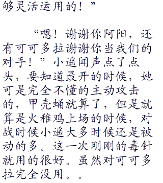 “可可多拉你没问题吧!”弹飞的可可多拉掉在了沙地上,随后又重新跳了起来,摇了摇脑袋,将在头上的沙子都摇掉了,阳见状对着可可多拉说道。毕竟刚刚出生,如果没办法的话是不能够太勉强的。可可多拉闻声却是摇了摇脑袋坚定的叫道。阳见状笑了笑开口道。“好。。那就继续上吧!”