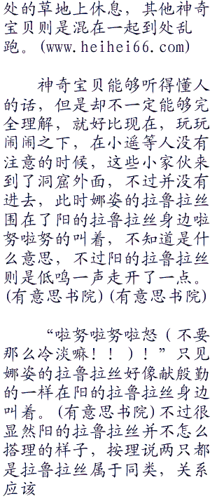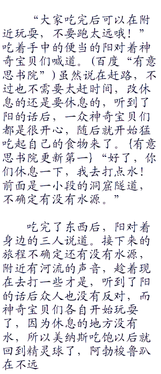 “好。。我肚子早就饿了!”听到了阳的话后小胜立刻开心的说道。因为方便旅行所以午餐早就都准备好了便当了,当然神奇宝贝被的食物也不能少,所以众人将神奇宝贝都放了出来了。然后给它们准备了食物,神奇宝贝的食物准备起来还是比较方便一些的。