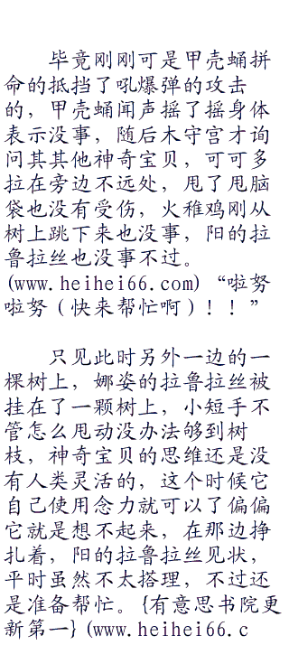 木守宫和可可多拉带着甲壳蛹躲避着,而两只拉鲁拉丝和火稚鸡也是各自躲避,但是吼爆弹并没有受过训练,而且正处于暴怒状态也不会去躲避攻击直接被其中的一道空气切割命中了,强大的爆炸之中,只见烟雾之中,受了伤的吼爆弹眼中冒着愤怒的火光来。