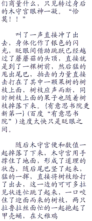 而这一边的木守宫它们,和阳等人分开已经大半天了,再过几个小时就要天黑了,而这段时间里面到处被其他神奇宝贝追赶逃跑和作战,肚子早就已经饿得咕咕叫了,一路下来都已经没什么精力了,而这个时候,走在队伍前面的火稚鸡抬头看到了前方不远处顿时兴奋的大叫了起来。“迦莫迦莫(快看)!!”