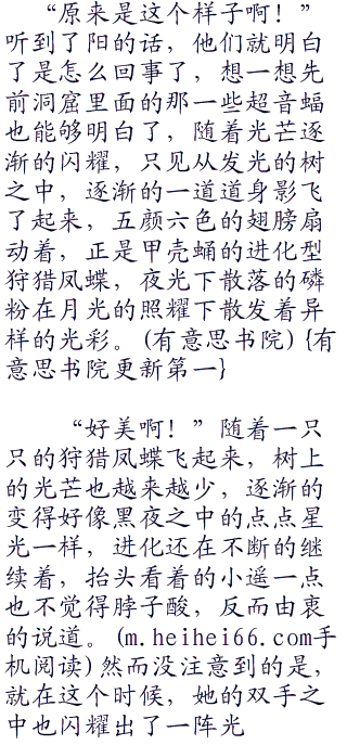 只见眼前的一片树林,原本漆黑的树木之上,闪耀出点点斑点光芒,每一棵树都是慢慢的被光芒包裹了起来,黑夜之中显得极为耀眼和漂亮。小遥惊讶的看着这一幕却没有出声。这么奇特的景象将姐弟两个人的视线都给吸引了,不知道到底发生了什么事情。“到底。。到底是怎么回事??”
