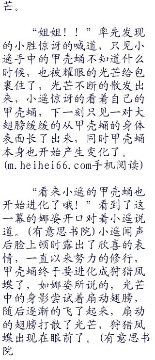 “什么?甲壳蛹?那它们现在是在。”闻声后小遥惊讶的说道。那些发光的东西是甲壳蛹,现在它们已经是一个发光体了,根本看不出来是甲壳蛹。不过想来阳应该不会说错。可是如果那些都是甲壳蛹的话,那么它们现在都在散发着光芒也就是说。“没错,它们在进化,所以刚刚虽然你们没感觉,但是我们靠近的时候,它们已经对我们抱有敌意了!”