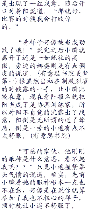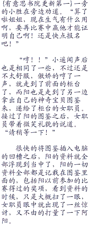 “不用客气,这是我应该说的!”乔伊小姐将阳等人的精灵球都收下以后开口说道。不管到什么地方,在接待客人和照顾神奇宝贝的时候,乔伊小姐都是温和又亲切的样子,而同时阳也开口问道。“对了乔伊小姐,听说再过几天就是神奇宝贝华丽大赛了,不知道举办的会场在什么地方呢!”