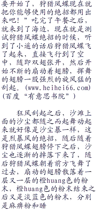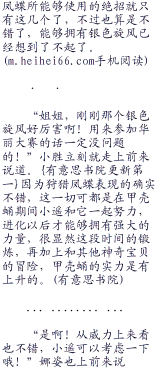 “甲壳蛹进化成狩猎凤蝶之后,你打算让它上场吗?问题是先前的锻炼,并没有针对狩猎凤蝶的,这样没问题吗?”阳见小遥还不明白自己的意思,不由的开口说道。其实在小遥的安排中,如果甲壳蛹不进化的话,那到时候只能是让火稚鸡上场了,不过现在狩猎凤蝶进化了,她只顾着高兴却忘记自己并没有针对狩猎凤蝶做特训呢!