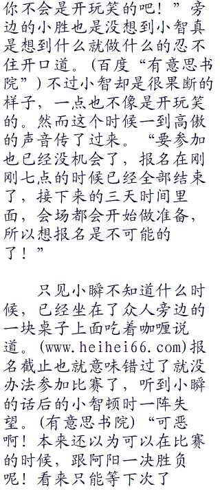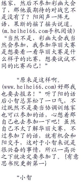 “对啊!我已经报名登记完毕了,三天之后比赛就要开始了,所以会多在凯那市逗留几天!”阳闻声后点了点头回应道。而听到了阳的话后小智则是一阵惊讶。“阿阳,你打算当协调训练家吗?那彩幽大会怎么办?难道你要半途而废吗??”