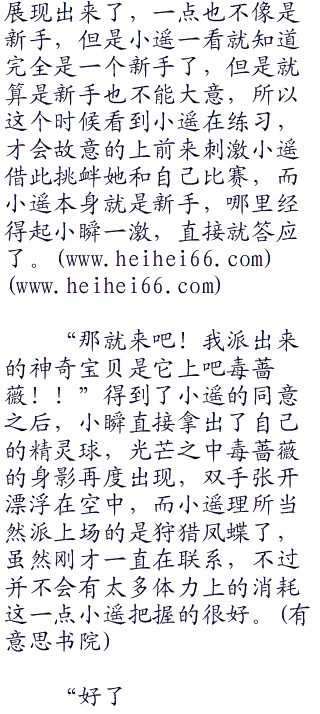 “别误会,你的狩猎凤蝶培养的很优秀,不过应该不去全是你的功劳吧!作为训练家也要能匹配的上神奇宝贝才可以,你真的以为自己能够在接下来三天的时间里面,有多大的进步吗?太天真了!”小瞬闻声后直截了当的开口说道。很显然就是看不好小遥的意思了。