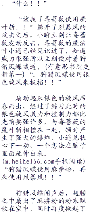 “你。。你的话是什么意思??”听到了小瞬的话后,小遥先是一愣,不过很快的就恢复了过来皱着眉头说道。她可是很认真的在跟狩猎凤蝶做训练的,而且最重要的是,狩猎凤蝶自己也相当的努力,可是他却说自己的狩猎凤蝶只是半吊子,实在是太可恶了这个家伙。饶是脾气再好也忍不住了。