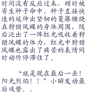 “呃小瞬??”看清来人的时候不由的一愣,只见小瞬依旧是高傲的样子,一手拿着盘子一手插在口袋里面走上前来,将盘子递给了小遥。小遥愣愣的说了声谢谢,心道这个男生看样子也没那么讨厌,不过这只是前一刻,下一刻“你就打算让你的狩猎凤蝶这样的半吊子参加比赛吗??”
