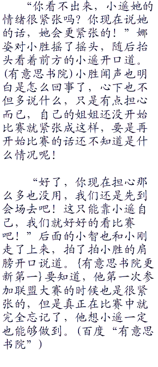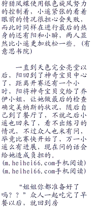 “呼。今天看来会是一个好天气呢!阿阳和小瞬是很厉害,但是我相信只要是足够的努力,我们还是有机会了!接下来我们就来试试三个圆盘的控制吧!”看着大海,感受着海风的吹拂,小遥努力让自己打起精神来,随后对着头顶的狩猎凤蝶鼓励道,狩猎凤蝶闻声也是点了点头。