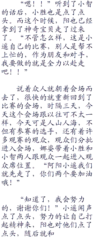在接下来的日子里面,阳依旧带着美纳斯热身,而小遥并没有因为被小胜打败了而意志消沉,反而跟狩猎凤蝶配合更加的默契了起来,这一点让小瞬感到惊讶,不过心中同样想着,不“三零七”过是在做无用功而已,不过不管是谁,都在准备着迎接神奇宝贝华丽大赛的到来。