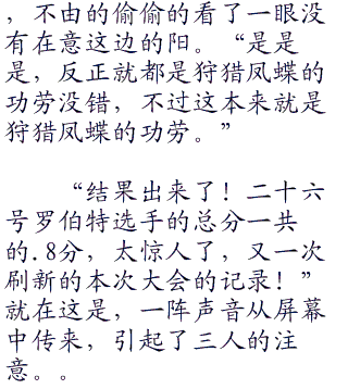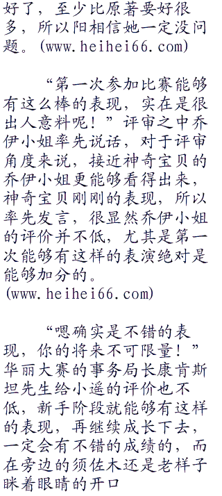 而此时的小遥在地上也摆好了姿势了,狩猎凤蝶缓缓的降落在小遥的头顶,而五个圆盘随着自转呈现五角星的状态降落在小遥周身,小遥的表演结束了,片刻的寂静之后,主持人薇薇安的声音响起了。“太美妙了,银色风中闪闪发光的粉末如同闪耀的星星一般!很难想像小遥选手只是第一次参加比赛!”
