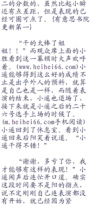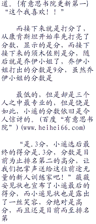 “好。。接下来由我们的三位评审来给小遥选手打分!”随后薇薇安将镜头转向了评审了,接下来是最紧张的时刻了,能不能晋级到决赛就要看现在了,小遥也是很紧张的看着三个评审,同时还有小胜等人,阳倒是不担心,小遥的表现确实已经很