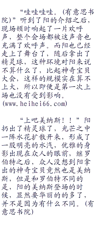 “接下来是第二十七位选手阿阳选手,根据资料他也是第一次参加神奇宝贝华丽大赛,不过,阿阳选手跟一般的选手可不一样,虽然协调训练家是新人,但是作为训练家,他是曾经蝉联关东石英大会冠军和城都白银大会冠军还曾经拿下了橘子联盟胜利者杯的优胜!!”