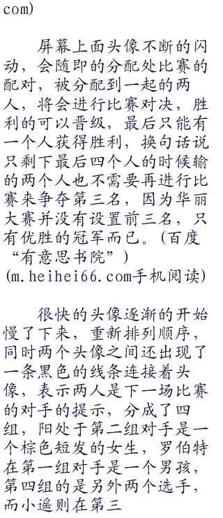 华丽大赛的参赛者绝对不止有那么一点,起码有五六十人,按照晋级制的话,最后剩下的绝对不是八个人,但是华丽大赛的晋级制度是不一样的,不管参加比赛的有多少人,到最后只会选出八个分数最高的选手,换句话说,就算你跟晋级的八人之中分数最低的只差了零点一分也只能遗憾淘汰。