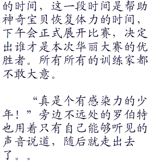 大约有五十个人的比赛,整个上午都在持续着,普通的华丽大赛只会有一天的时间就会全部比赛完毕,除非是收集到了五个缎带勋章以后,参加的大型华丽庆典,这样的比赛会分成很多天来举行,而在表演赛结束以后,接下来会将预赛中表现好的训练家抽取进入决赛也就是华丽对抗赛。