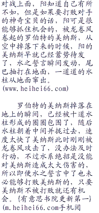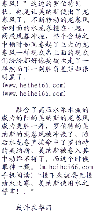 “美纳斯使用龙卷风!!”阳见状连忙对着自己的美纳斯喊道,只见美纳斯身上闪耀光芒龙卷风骤然卷起了,强大的龙卷风转动的同时,高压水泵命中在龙卷风之上的瞬间,只见高压水泵的水流纷纷被龙卷风告诉转动给卷了进去,水流卷进了龙卷风之中,反而增强了龙卷风的威力。随后朝着罗伯特的美纳斯冲了过去。