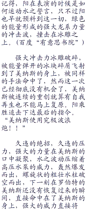 “美纳斯水之波动!!”就在薇薇安的声音刚刚落下了,只见阳已经开口道,美纳斯闻声后,口中再度凝聚出了一股强烈的水球压缩成了起来,砰的一声直接爆发了出去,水之波动破空而出,划过空气,直接击中了眼前的冰块,冰块应声而碎,水之波动爆发的威力将冰块是碎片都弹了出去。