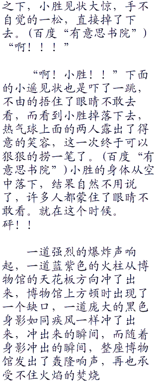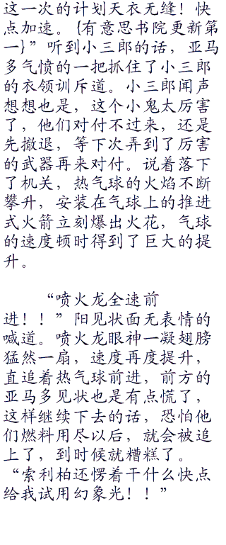 “索利柏使用幻象光!!”只见热气球上,一道阴险的笑容闪耀,小胜反应过来抬起头就看到了一道彩色的光线迎面而来,惊慌之下,连忙松开了手躲避攻击,在铁箱上面滚了一圈避开了幻象光,避开了幻象光的攻击,但是身体却被高空的大风吹了出去从铁箱上滚了下来。惊慌之下抓着铁箱的边缘。