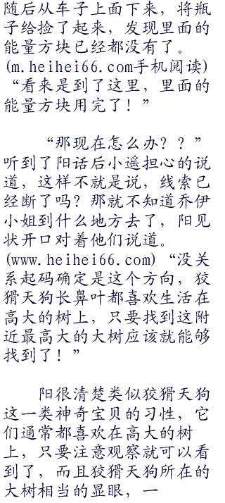 不过瓶子里面的能量方块数量始终有限,不知道前进了多久以后,瓶子里面的能量方块已经用尽了,乔伊无奈之下也只能将瓶子也丢下,现在她的心中只能希望,这些线索足够让阳等人找到她,好在这只狡猾天狗没有带着自己走太远,没过多久就带着自己跳上了一颗大树。