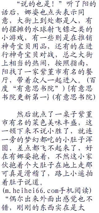 “走咯!!”听到阳的话,小胜高兴的喊道,随后一行人就走进了紫堇市了,打量了一下四周,虽然没有相卡那兹市和凯那市那样的大都市看起来那么壮观,不过却也是很热闹,只因为紫堇市这里就算是到了晚上也是灯火通明,许多市民都喜欢晚上出来玩。