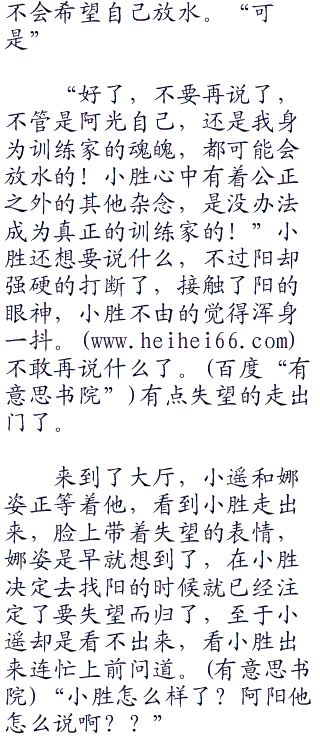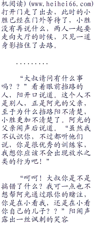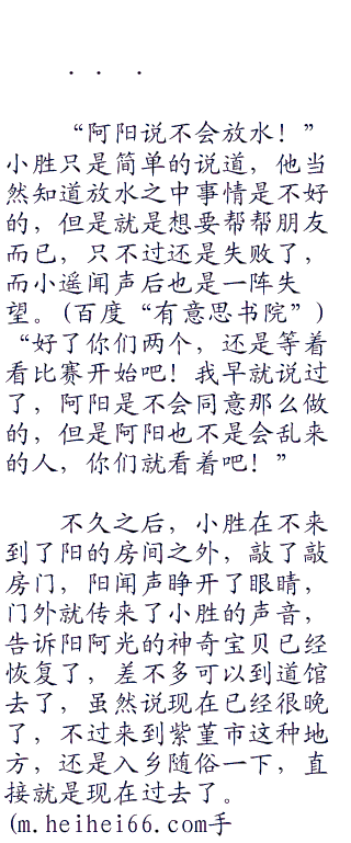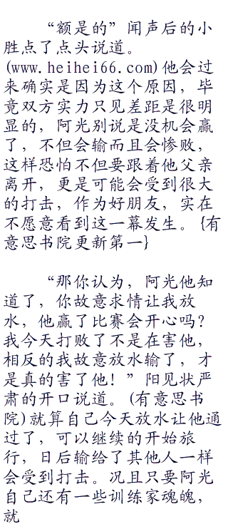 “呃。。那个阿阳,阿光他才刚刚出来旅行,他是下定了很大的决心的,所以你”小胜也是好一阵犹豫,最后才开口说道。阳闻声睁开了眼睛,小胜还没有说完的时候,阳就转过头看着他。“所以你想要我放水?让阿光赢,这样他父亲就不会带他回去了?”