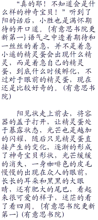 “那我们应该走哪里呢??”听到了小胜的话后,小遥开口好奇的问道。其实她走哪里都是一样的,只要能参加华丽大赛就可以了。阳闻声后开口道。“那就先去绿荫镇吧!我记得先前有看到宣传海报,绿荫镇不就后要举行华丽大赛绿荫大会,先去绿荫镇然后在到釜炎镇去!”
