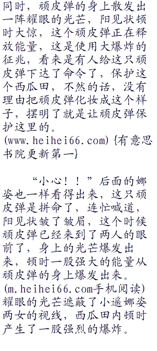 只见阳刚刚将小胜拉开的时候,那巨大的西瓜上面爆发出一股强大的金色电流,阳见状顺势拉着小胜扑倒在地,电流从两人上空划过好在没有命中两人,但是这个时候,巨大的西瓜已经