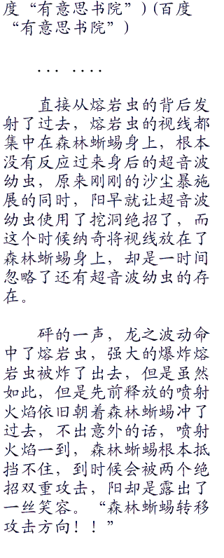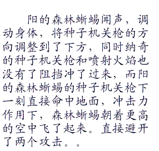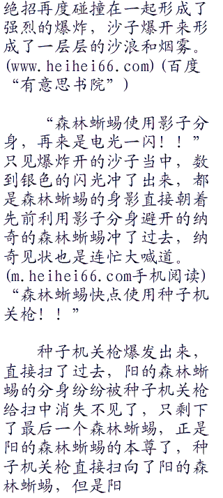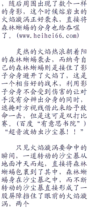 随后砰的一声爆炸开来,而同时空中,两只森林蜥蜴同时使用了电光一闪,顿时在空中碰撞在一起了,两道银色的闪光不断的在空中相撞互不相让,纳奇直接将目标对准了森林蜥蜴。“森林蜥蜴使用影子分身,熔岩虫直接使用火焰漩涡!!”