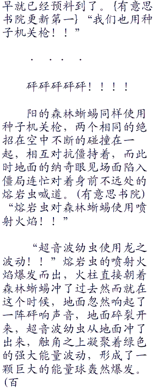 “比赛开始!!”娜姿见状将手放下,宣布了比赛开始,四只神奇宝贝都是已经蓄势待发了,得到了比赛开始的提示之后,瞬间就爆发出了斗志,纳奇抢先发动攻势。“森林蜥蜴使用种子机关枪,熔岩虫使用原始之力!!”