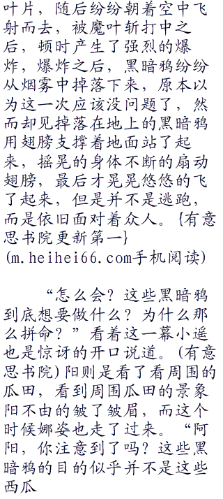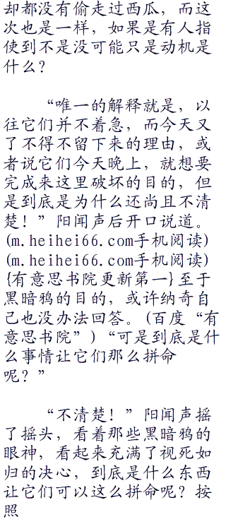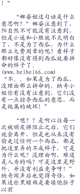“这个是黑暗鸦??原来这些家伙是黑暗鸦啊?”小胜惊讶的开口道。没错,掉落在地上的是一只黑暗鸦,而其他的毫无疑问也是了,说起来,今天也听到纳奇说过了,这里经常有黑暗鸦过来偷盗西瓜的,看来就是这些家伙了。而纳奇也开口了。“没错,它们就是经常到这里来捣乱的黑暗鸦。”