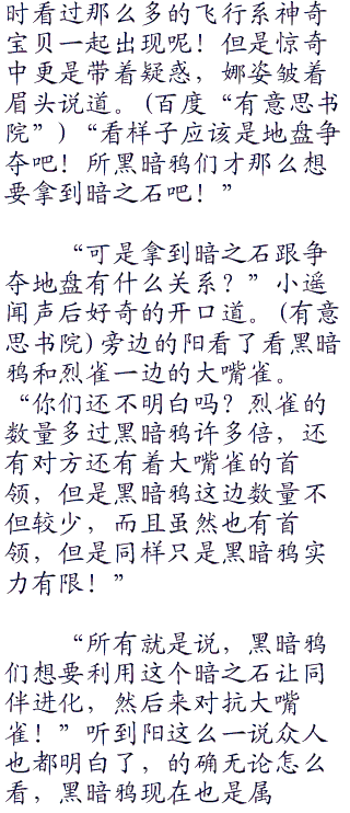 从眼前的情况就可以看得出来了,对峙之间烈雀的数量起码是黑暗鸦的两倍到三倍之多了,所以一半都是比较少见的,而且黑暗鸦大多行动在黑夜中,之所以这段时间那么反常的经常跑来这里捣乱,目的却是是因为暗之石,但是想要暗之石是有理由的。