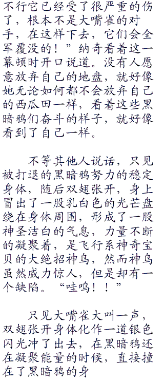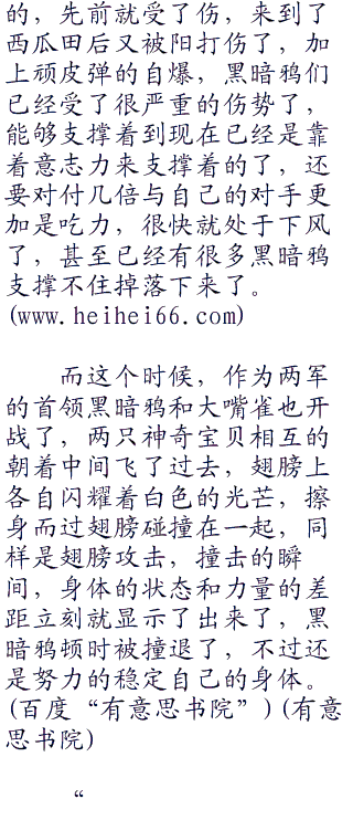 几仗下来都是惨遭失败,当然因为它们的意志力太强大,烈雀族群一时间也没办法做到把它们赶出去,所以只能时不时的对它们发动攻击,而黑暗鸦们也是全力抵抗,但是对方不止是数量超过自己一族许多,烦有着做所谓首领的大嘴雀实力强大它们根本应付不了。