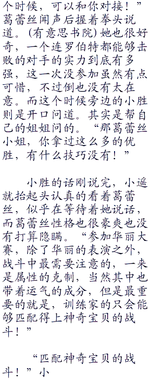 可以说葛蕾丝不但有获得比赛优胜的记录,而且还是一个已经拿到了三次优胜的优秀协调训练家,要知道华丽大赛举办的并不多,能够拿到三个已经可以说是优秀的协调训练家了,要参加华丽大赛的大型庆典,仅仅需要五个缎带勋章而已,但是就是这五个缎带勋章让许多优秀的协调训练家都希望落空,因为竞争实在激烈。