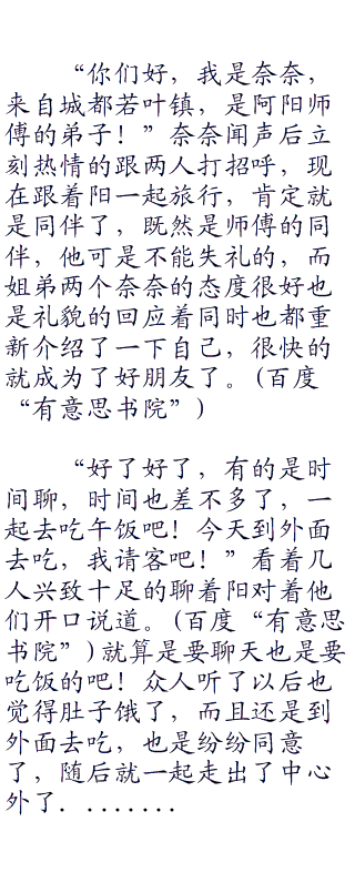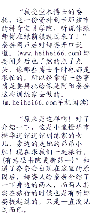 “师傅!!”很明显这个女生就是奈奈了,而奈奈也在四处张望着,很快就发现了阳的身影立刻挥着手朝着这边走过来了,而阳也是挥了挥手,很快的奈奈就来到了阳的身前,随后立刻兴奋的开口“三零零”说道。“真是好久不见了师傅,这段时间我好怀念跟你还有娜姿姐一起旅行的时候!”