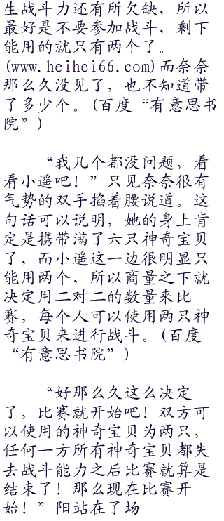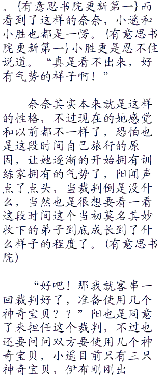 “话说奈奈刚刚来,神奇宝贝没问题吗??”走在去比赛场地的路上,小遥开口问道,害怕奈奈的神奇宝贝没有休息好,这样的话就算是赢了她也不会开心的,而奈奈闻声笑应道。“没事的放心好了,我是刚刚从卡那兹市乔伊小姐那里,把它们领回来的,所以完全不用担心的!”