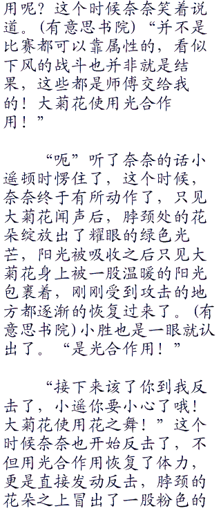 “是大菊花耶!城都地方的初始神奇宝贝之一,还是第一次这么近距离的看到,太棒了!”看着眼前场中的神奇宝贝,小胜兴奋的站起身来说道。这大菊花确实是第一次见,要知道神奇宝贝的知识里面,新手训练家使用的初始神奇宝贝可是必修课而且是最基本的。“可是面对火系的火稚鸡拿出草系的大菊花没问题吧?”