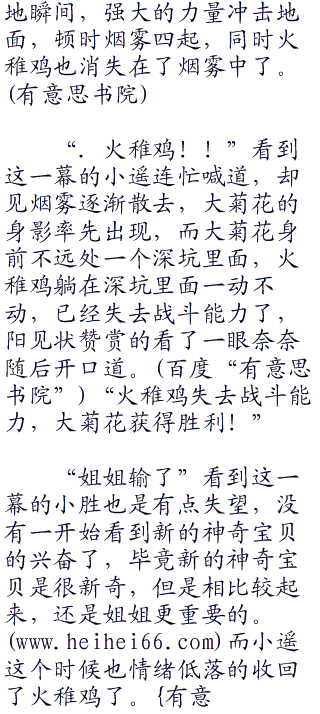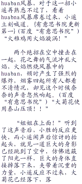 小遥见一招命中了乘胜追击,使出了更加强大的绝招,火稚鸡最强大一招进行攻击,螺旋状的火焰攻势席卷而来,大菊花禁皱眉头紧紧的盯着眼前的攻击,奈奈依旧没有丝毫的反应,下一刻火焰漩涡再度命中了大菊花,大菊花四肢支撑着地面,向后退去却没有倒下,直接用自己的身体抵挡着。只见片刻后火焰漩涡再度散去了。看着大菊花依旧站立着,小遥顿时一阵惊讶。