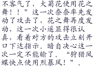 “火稚鸡使用火花攻击!”所以看到现在自己使用的火系神奇宝贝克制对方的神奇宝贝的时候,也是着急着先攻想要打败对手,所以直接对火稚鸡下达了命令。火稚鸡闻声也是直接吐出了高温的火花,而对面的奈奈见状始终带着一丝微笑,却没有让大菊花避开攻击的意思。