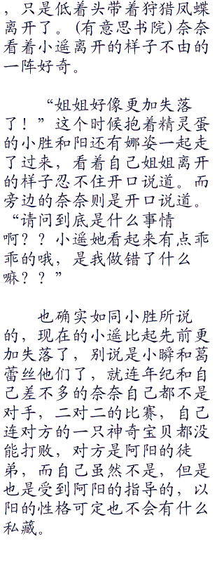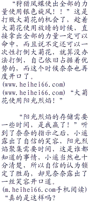 小遥再度发动绝招银色旋风打向了大菊花,正在使用光合作用回复着体力的大菊花没办法躲避,直接被银色旋风给命中了,不过光合作用的光辉依旧笼罩在身上,虽然受到了攻击了,但是同时也有光合作用弥补,并没有消耗太多的体力,而这个时候奈奈再度开口道。“大菊花使用放晴!!”