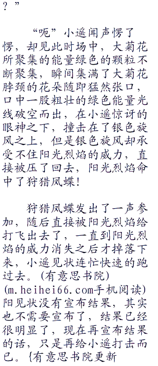 只见听到了奈奈的命令之后,大菊花顶着银色旋风的攻击,发动了绝招放晴,只见空中的阳光,瞬间被放大了一样,散发出了刺眼的光芒,同时温度也提升了许多,这个时候小遥不太明白,为什么奈奈不反击,反而是使用了一个没有多大用处的绝招。不过这可是一个好机会。