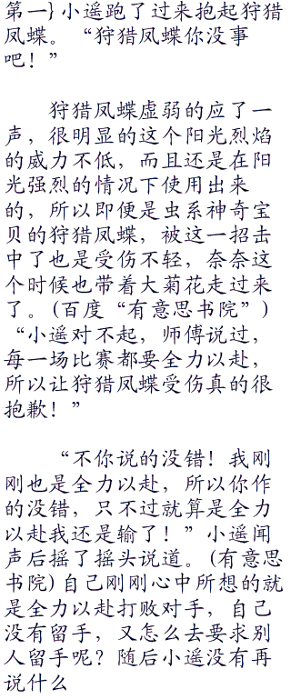 大菊花的体力本来就是很惊人的,再加上还有光合作用这样的绝招,更加是难缠,但是就算是光合作用也没办法百分之百恢复自身的体力的,所以这场比赛的胜负还尚不好说,小遥这一次不会那么轻易的让大菊花得逞了。“狩猎凤蝶,再来一次银色旋风!!”