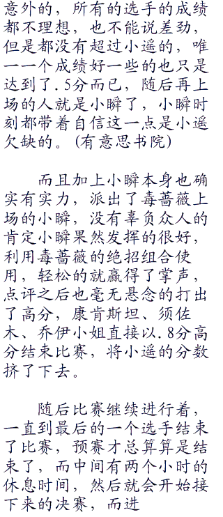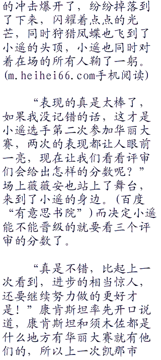 “我超喜欢的!”旁边的须木佐还是老样子,再旁边的乔伊小姐虽然没有说话,不过也是微笑的点了点头,很显然对于小遥出场的表现也是感觉不错的,观众席的小胜和奈奈也是努力的为小遥喝彩着,同时小遥也开始表演了对着狩猎凤蝶下达了命令。“狩猎凤蝶使用烈暴风!!”