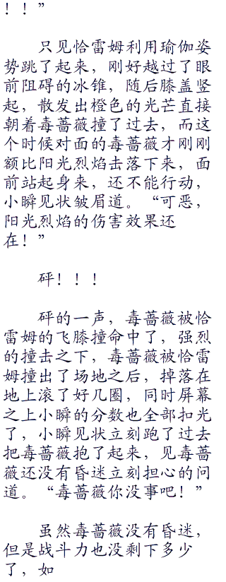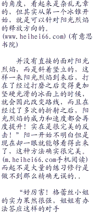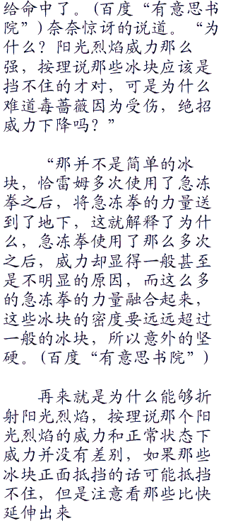 下一刻阳光烈焰到来了,击中在了第一根冰锥之上的时候,奇异的一幕发生了,冰锥竟然如同镜子一样,将阳光烈焰如同阳光烈焰一样折射开来,阳光烈焰被折射开撞击在了另外的一个冰锥上面,然后再产生折射,如此反而来好几次,折射之后,撞在了最后的一根冰锥上面的时候,最后折射的方向刚好是毒蔷薇所在的位置。