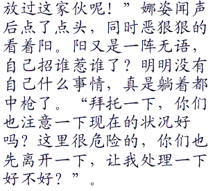 随着喷火龙降落下来,看着迎面走来的卡米兹蕾,阳忽然觉得一句话也说不出来,原本是心中满怀气愤的卡米兹蕾也是一样,见面的瞬间,在看看现在的情况,心中更多的是想念和担心,一上来就扑到了阳的怀中眼眶微微泛红似生气又似撒娇的说道。“可恶的家伙,非的要我来找你,每一次都那么冒险,这让我怎么放心的下你!”