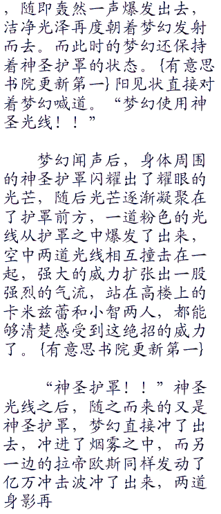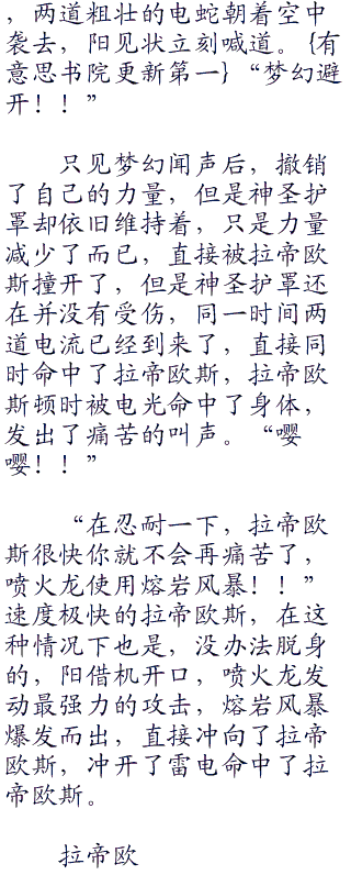 “你有什么办法吗??”听到了阳的话后,众人也反应过来了,现在可不是说这些的事情,拉帝欧斯现在可是还在疯狂当中呢!和梦幻两道身影不断的在空中撞击着,娜姿开口问道。一开始阳都想不到什么什么好的办法,但是现在却是有了一些想法了,笑着看着旁边的卡米兹蕾。