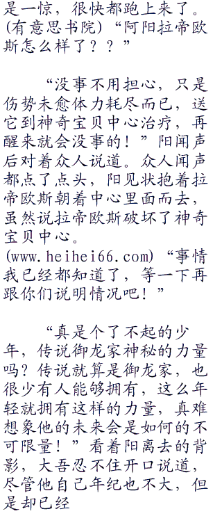 阳慢慢的走向了拉帝欧斯,此时的拉帝欧斯还在原地,依旧是怒愤的表情,但是阳靠近却并没有发动攻击,很快的,阳来到了拉帝欧斯的身前,缓缓的伸出手去,拉帝欧斯见状本能的将自己的脑袋向后避开,不过阳的手并没有停止,依旧是身这手放在了拉帝欧斯的脑袋上面。随后闭上了自己的眼睛。