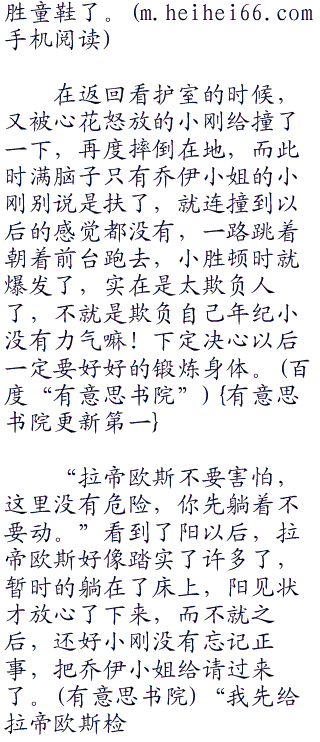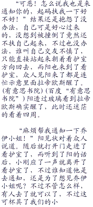 “真是的,走路都不嗯?阿阳你来了,拉帝欧斯醒了,快过去看看吧!”对面的人坐在地上抬起头刚想要抱怨的时候,看到是阳急忙开口说道。阳闻声也顾不上把小胜扶起来,直接朝着看护室方向跑过去了,娜姿和卡米兹蕾也一样跟了上去,只留下还坐在地上的小胜。